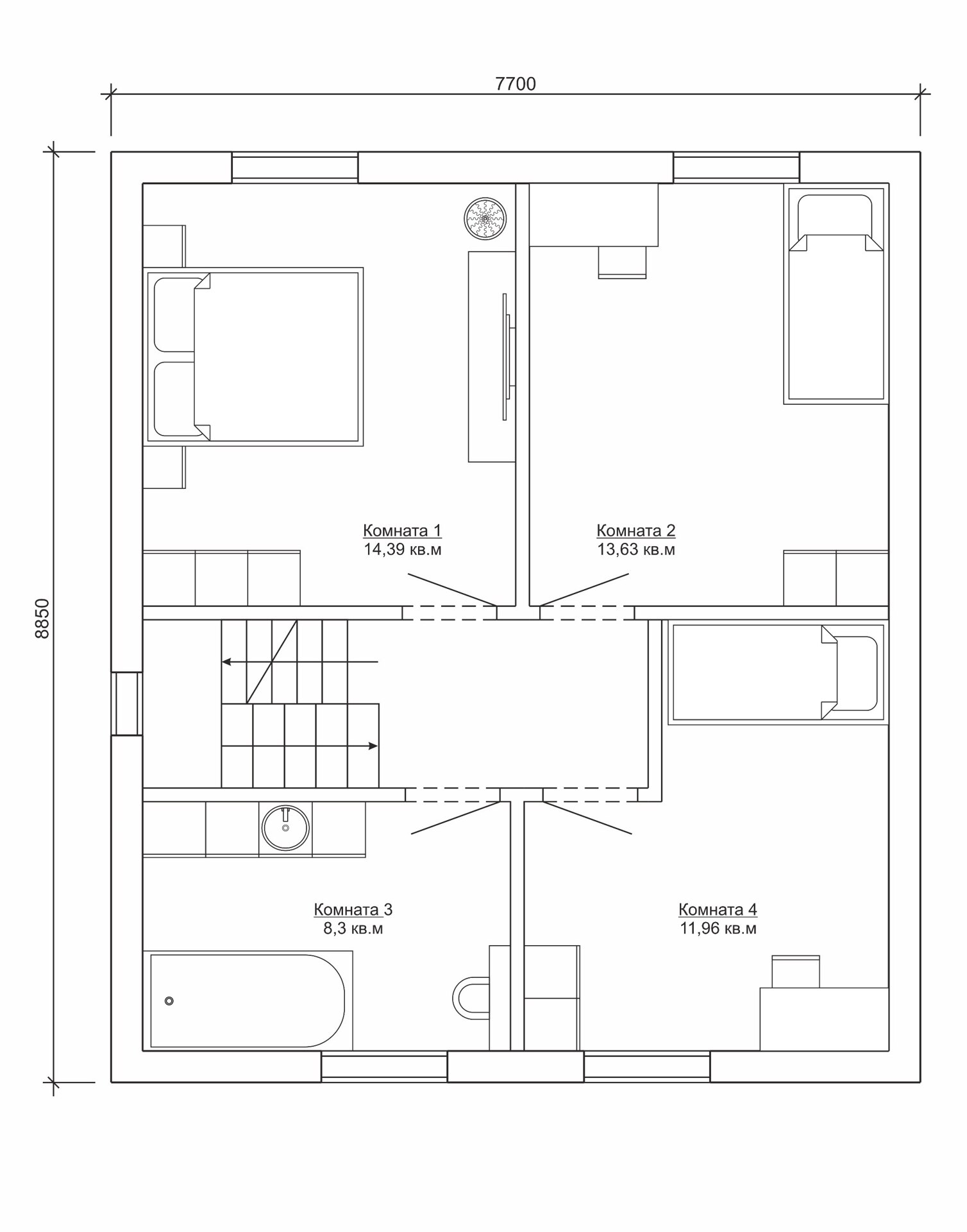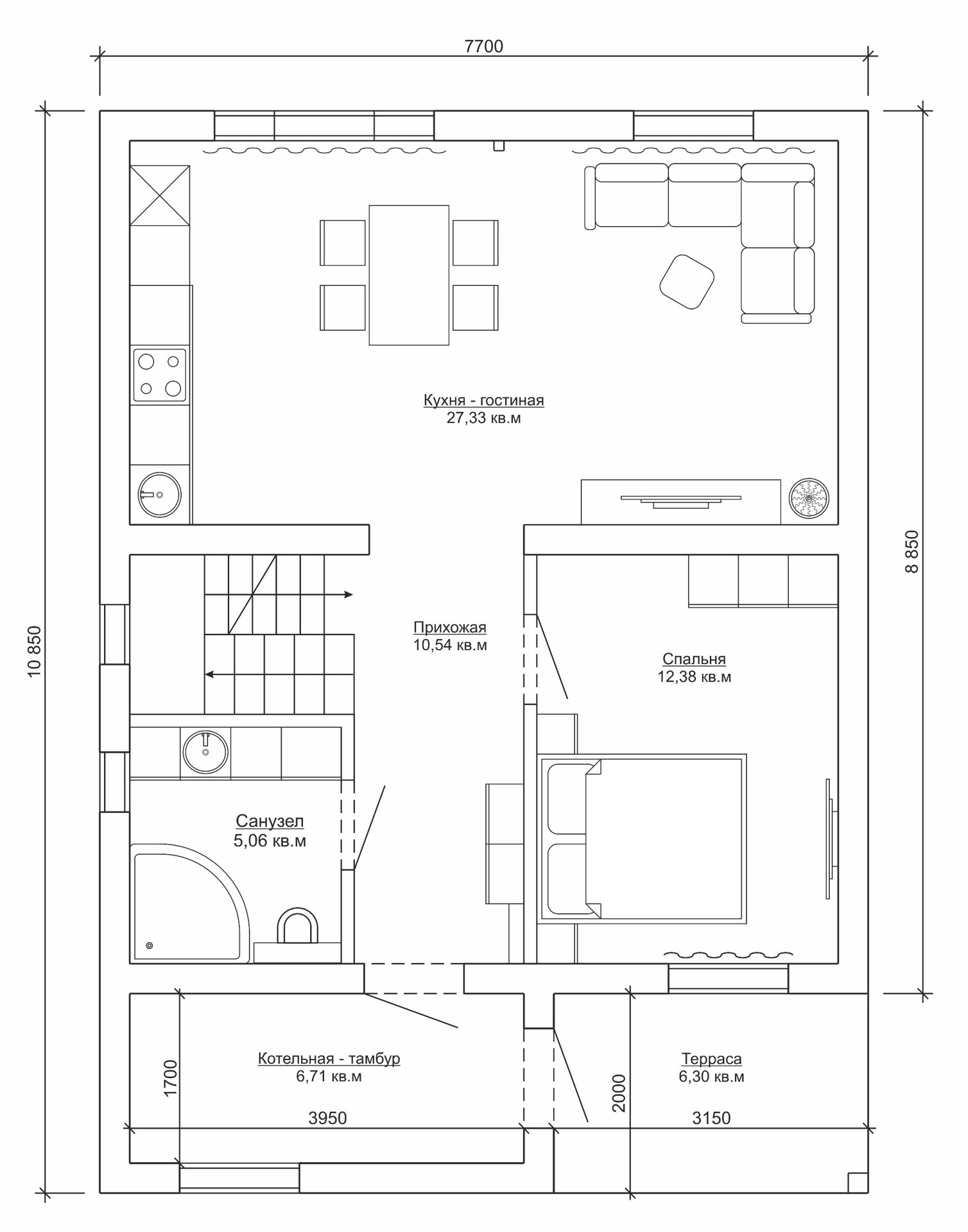 1 этаж - кухня-гостиная, спальня, санузел, тамбур-котельная